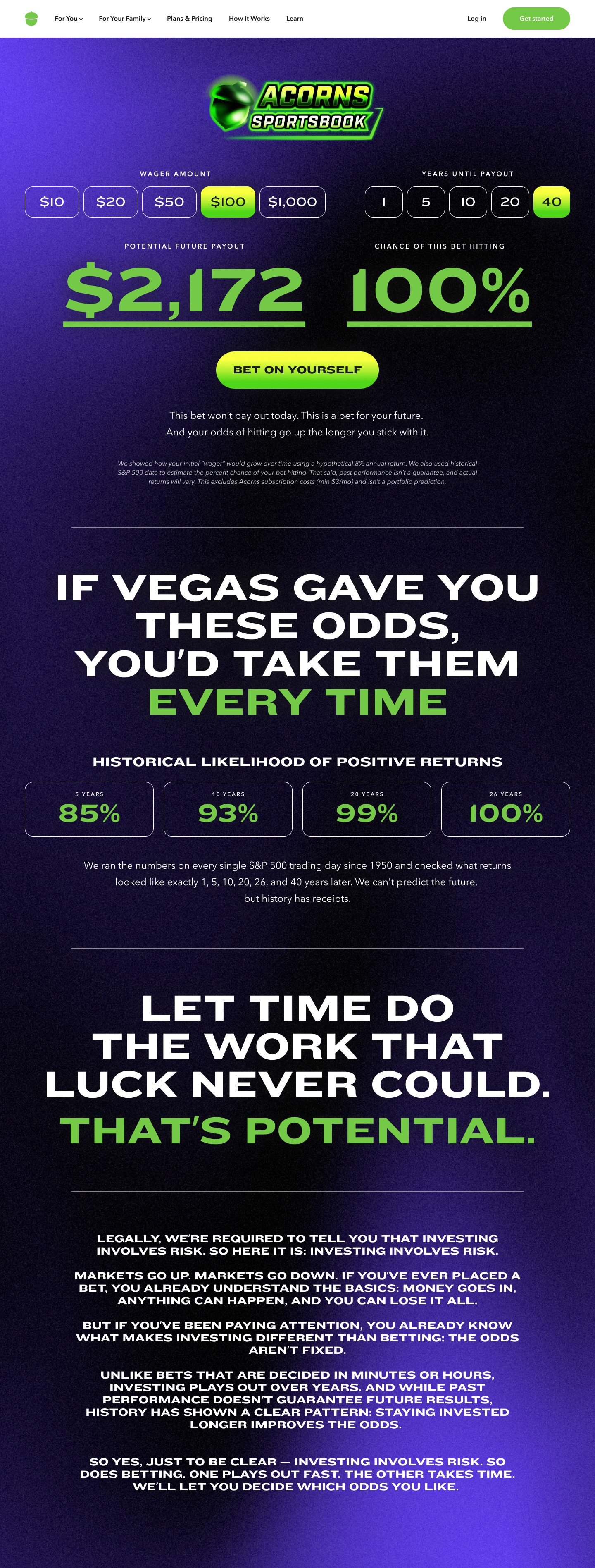 For Super Bowl 2026, we launched Acorns Sportsbook — a campaign that used the look and language of sports betting to make a different point. Instead of promoting uncertain outcomes, it highlighted the historical power of long-term investing and helped Acorns show up in a timely, culturally relevant way.